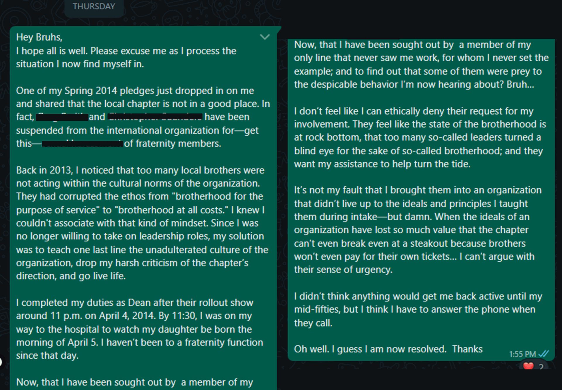 Context: The following is an article written in response to a crisis in our local chapter, where 2 individuals who had been vetted and found not to meet the standard of membership in the fraternity sought membership and legitimacy outside of our locality. Their subsequent actions, left unchecked, resulted in a campaign of predatory sexual harassment of younger fraternity members. This crisis of leadership is a large part of why the Pledge Culture Initiative has been launched prematurely.